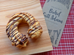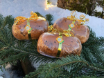 Mandelfülle:Mandeln gerieben, Rohrohrzucker, Rum, Butter, Rosinen, Zimt, Wasser, Brösel (Weizen/Dinkel)