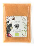 Wird beim Beutel ein Eck abgeschnitten und eine kleine „Wurst“ herausgedrückt, kann kein Sauerstoff eindringen und das Miso bleibt im Kühlschrank so gut wie ewig haltbar.