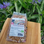 Zutaten: 50% Haferflocken, 30% Dinkelflocken, Sonnenblumenkerne, Honig, Sonnenblumenöl, Hanfsamen, Apfelchips, Blüten von Goldmelisse und Kornblume, kann Spuren von Nüssen enthalten